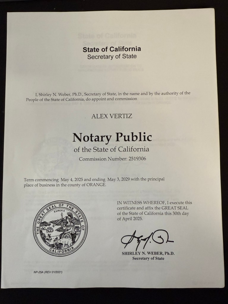 Hi! My name is Alex Vertiz, I am a certified notary in the state of California! I grew up in the city of Whittier and received my notary certificate in Orange County on behalf of the company I currently work for. I am a hardworking, dedicated individual who takes pride in providing the best customer service to all of my clientele! Thank for so much for your business!